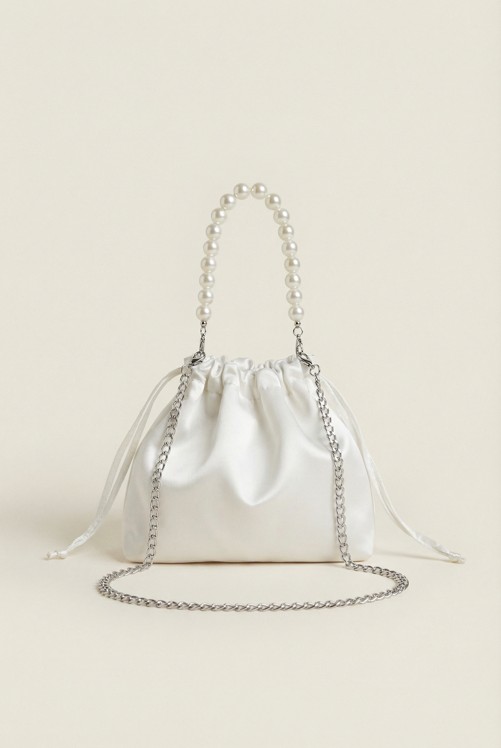 Der elegante Perlengriff verleiht der Tasche einen Hauch von Raffinesse und macht sie zu einem echten Blickfang. Die Perlen sind sorgfältig angeordnet und bilden einen sanften Bogen, der das Tragen in der Hand besonders angenehm macht. Alternativ kann die Tasche dank der abnehmbaren, silbernen Kette auch bequem über der Schulter getragen werden. Diese Flexibilität erlaubt es, den Look je nach Vorlieben und Anlass anzupassen.